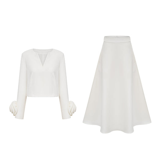 La Pétale Blanche — Cropped petal top and flared midi skirt