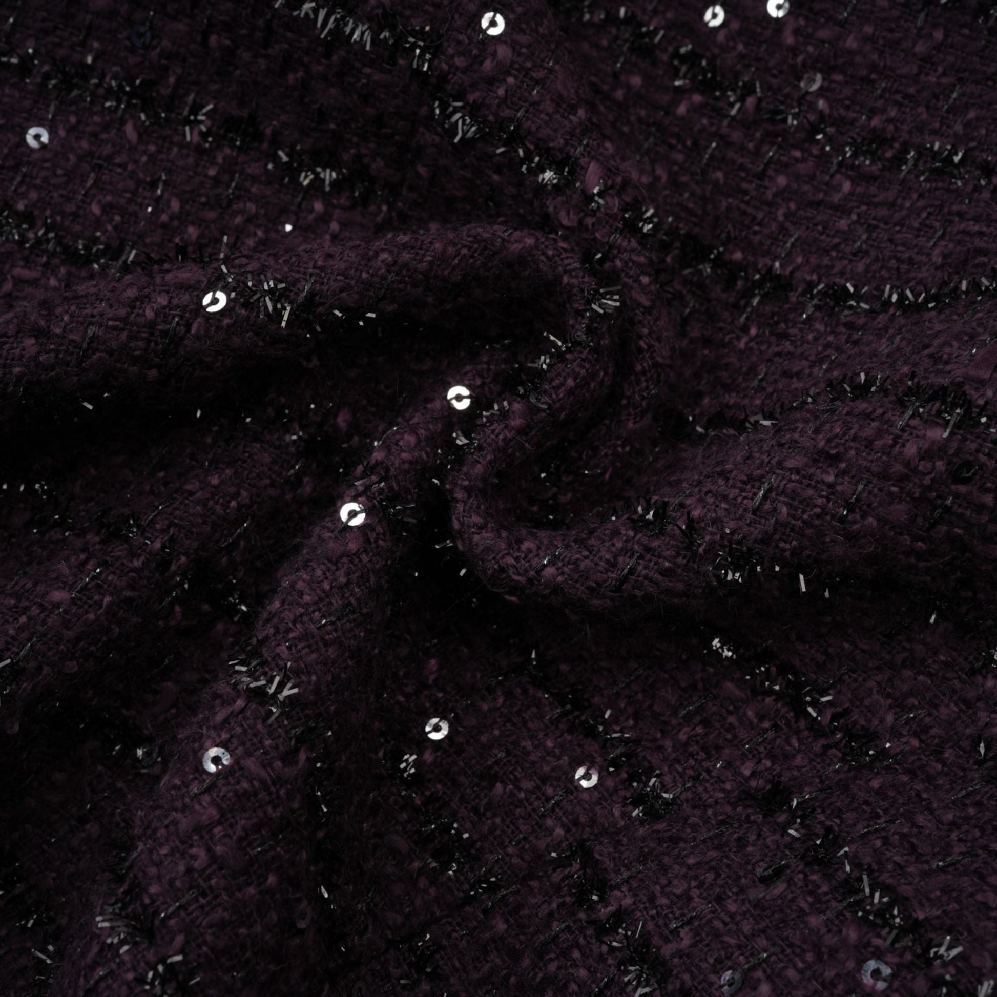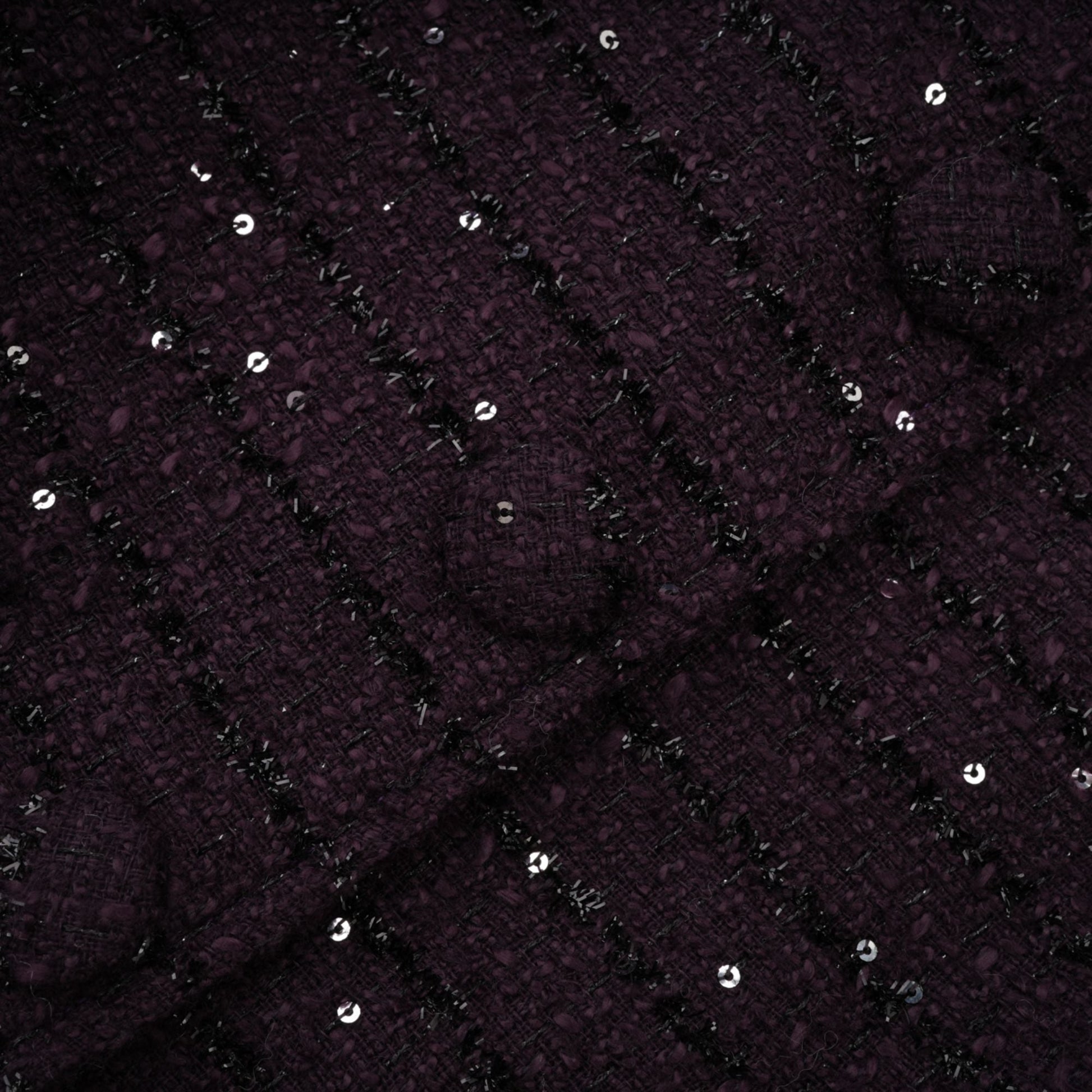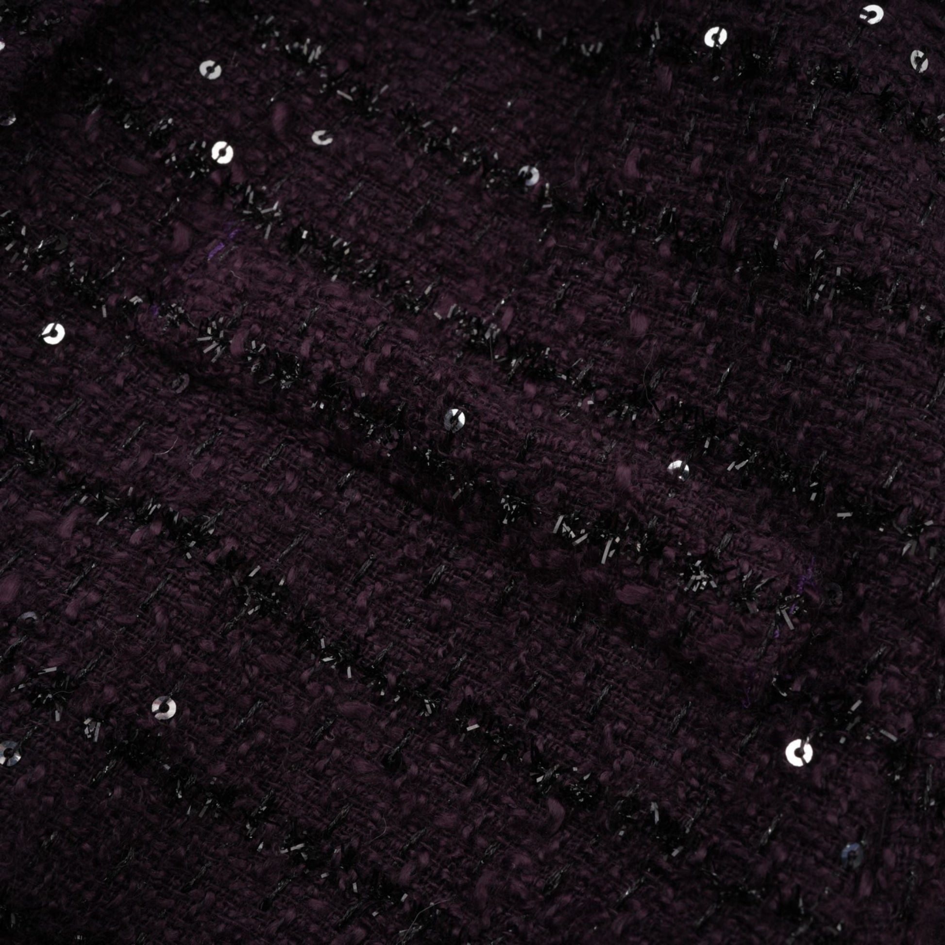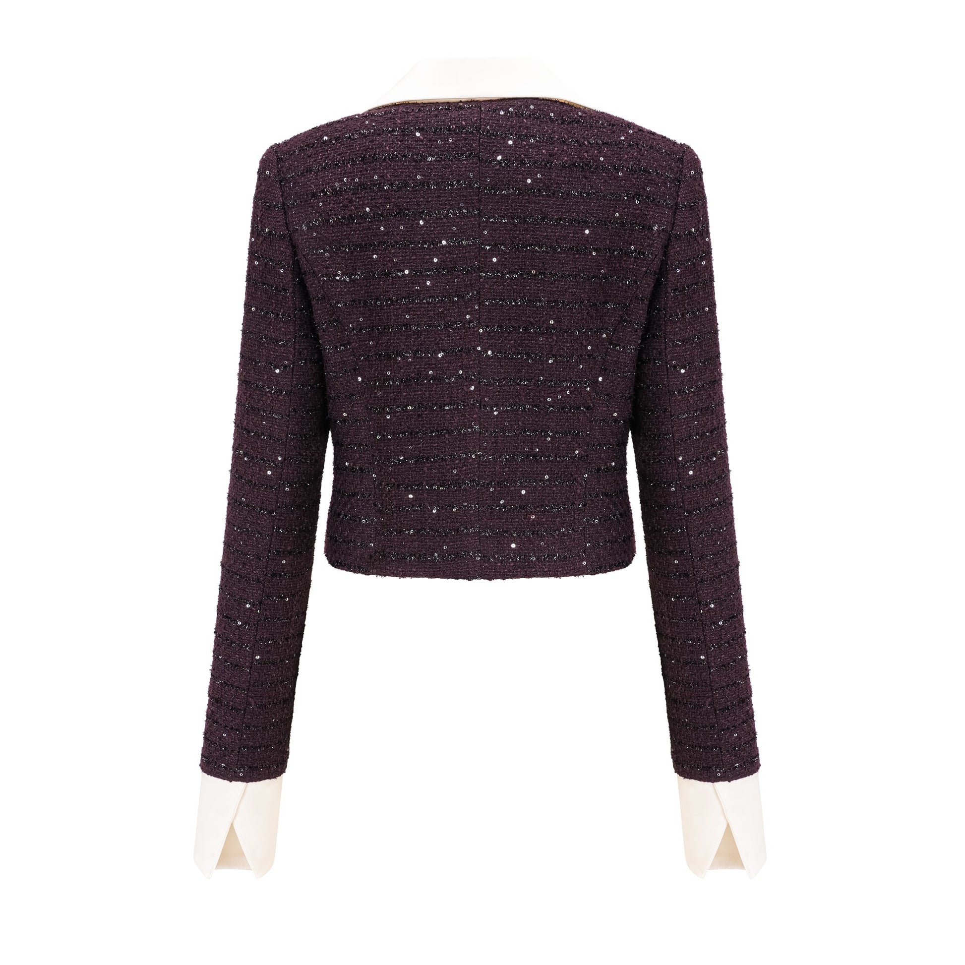 La Pourpre Éclatante captures modern tailoring through texture, contrast, and controlled luminosity. The deep purple tweed base is elevated with satin panelling and delicate sequin embellishment, creating dimension without excess.