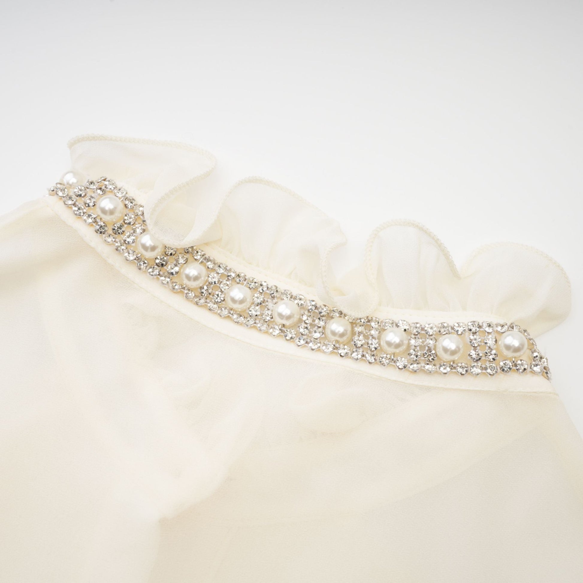Soft ruffles illuminated by delicate pearl and crystal detail.