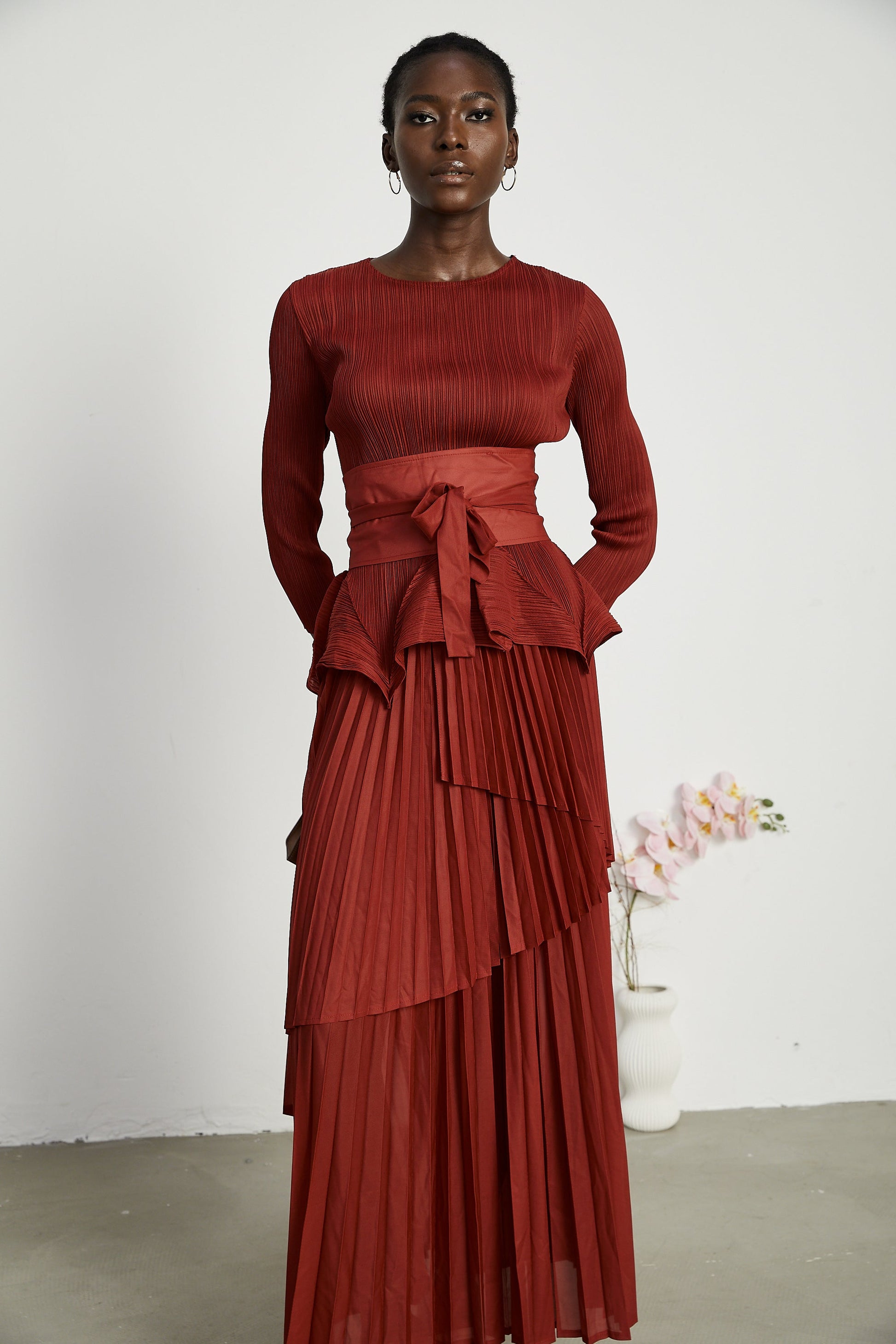 Crimson pleats sculpted into movement and structured volume.